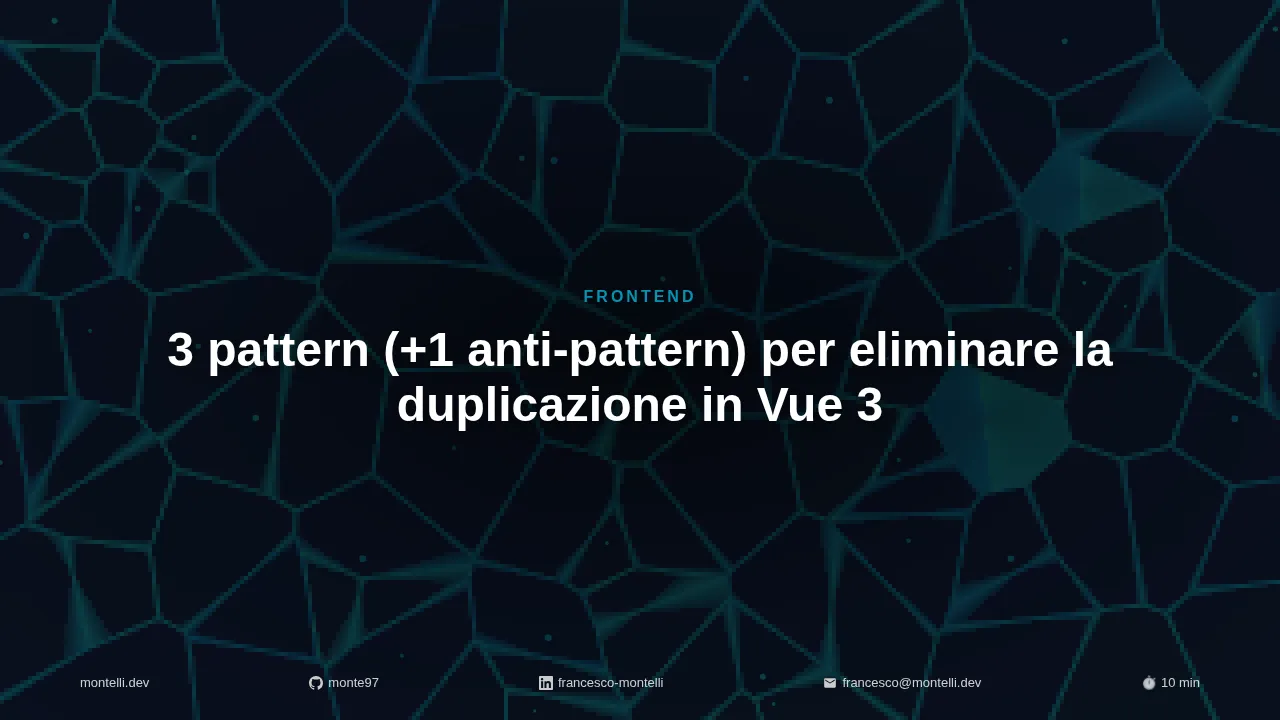 Tre pattern aiutano a gestire il problema, ciascuno per un tipo di duplicazione diverso. Un quarto caso mostra quando è meglio fermarsi. Gli esempi usano Nuxt 3 e Vuetify 3. Nel repository demo pinia-vue-demo si trova tutto il codice eseguibile.